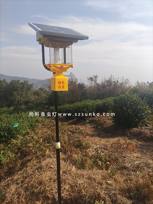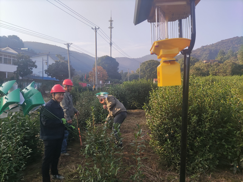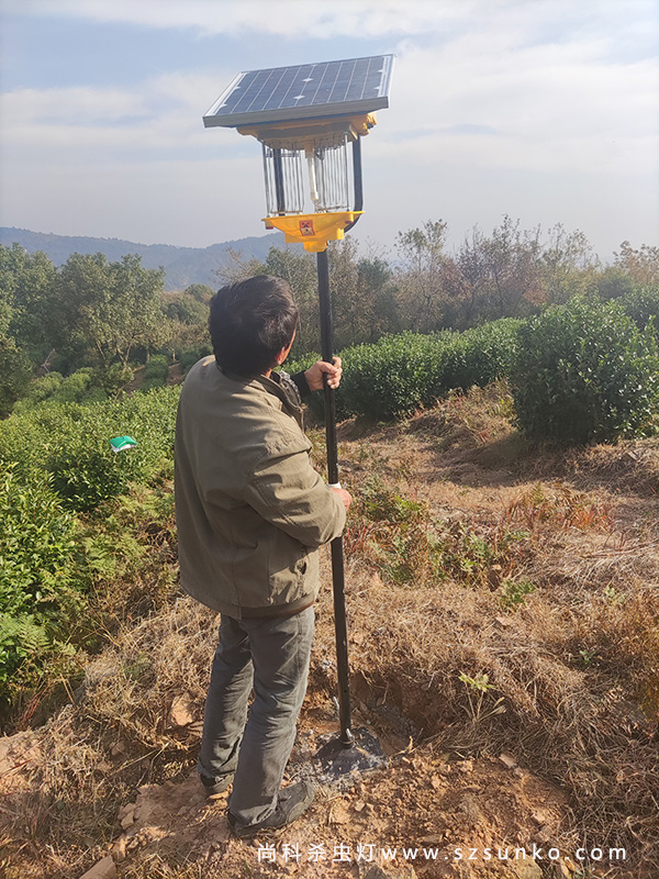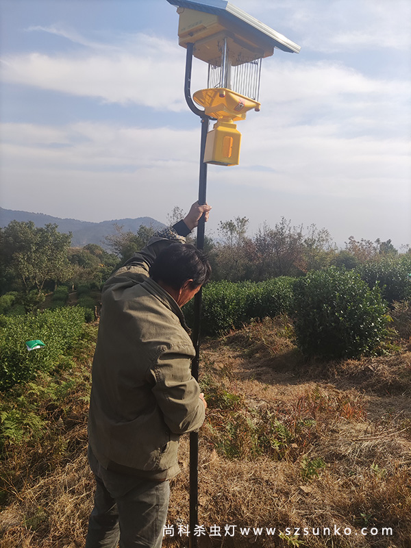上圖:安裝好后的太陽(yáng)能殺蟲燈,保護(hù)著茶園