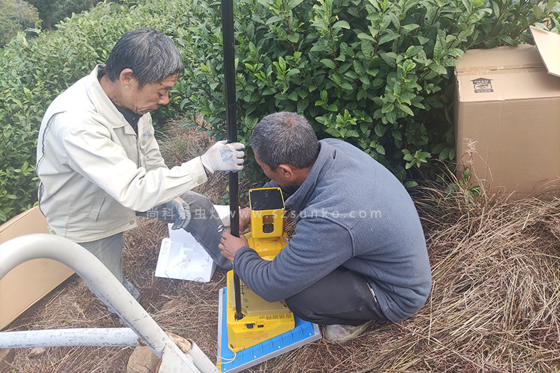 上圖:師傅在調(diào)節(jié)太陽(yáng)能殺蟲燈高度