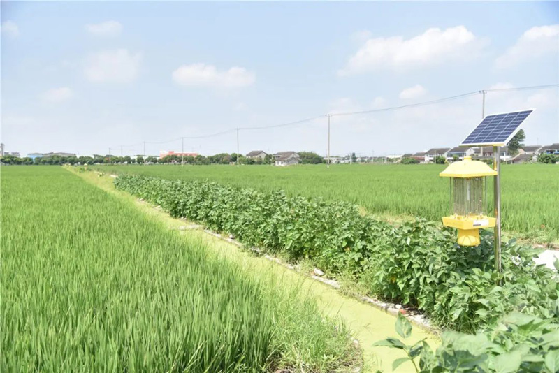 2020年8月份,上海徐行鎮(zhèn)開始使用物理滅蟲方式--太陽能殺蟲燈應對水稻田害蟲。在需要水稻綠色認證的高水平良田示范區(qū),總計安裝了10臺頻振式太陽能殺蟲燈,使用效果出乎意料。下面是記者實地拍攝的太陽能殺蟲燈場景圖片。