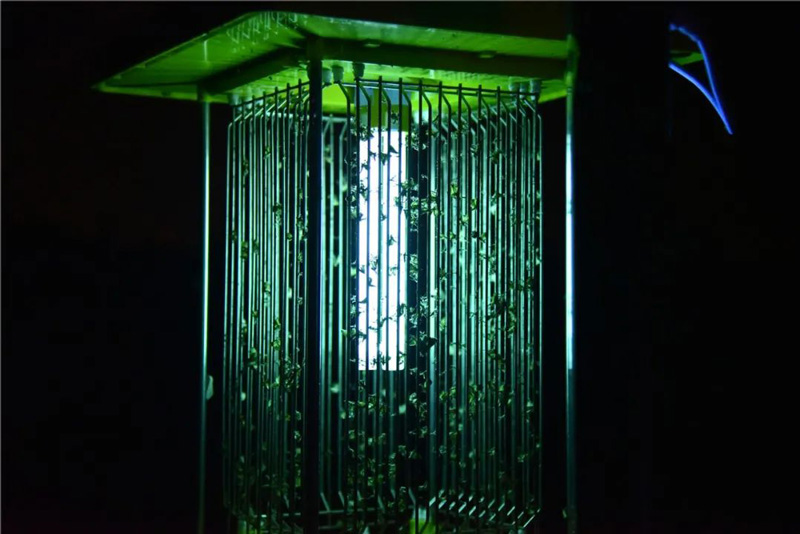 上圖:太陽能殺蟲燈夜間亮燈工作狀態(tài)